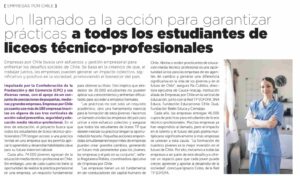 Impulsada por la Confederación de la Producción y del Comercio (CPC) y sus diversas ramas, con el apoyo de un conjunto de asociaciones de pequeñas, medianas y grandes empresas, Empresas por Chile ya cuenta con más de 180 empresas inscritas en alguna de sus tres verticales de acción: salud preventiva, seguridad y educación media técnico-profesional. En el área de educación, el proyecto busca que todos los estudiantes de liceos técnico-profesionales (TP) tengan acceso a una práctica formal en una empresa que les permita aplicar lo aprendido y desarrollar habilidades clave para su futura inserción laboral.
